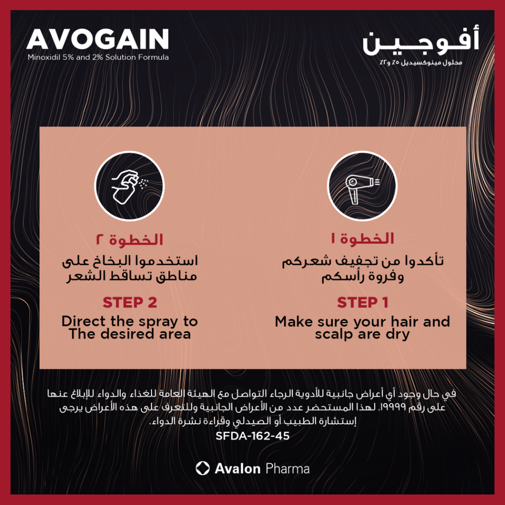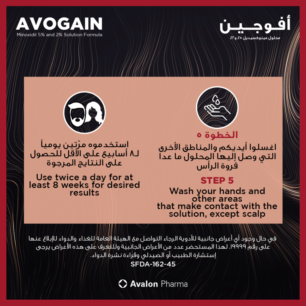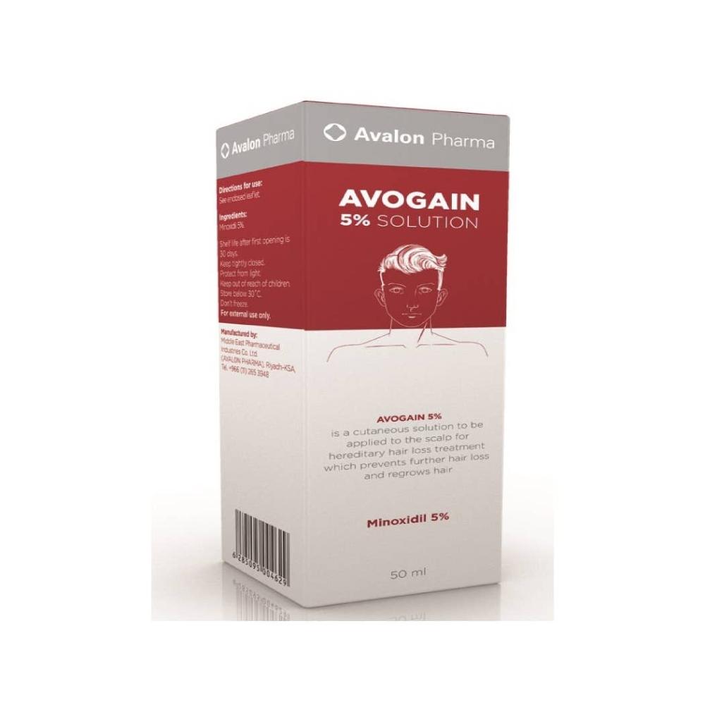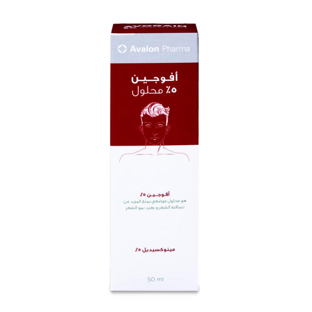 - أفوجين 5% هو محلول موضعي يعمل على تحفيز نمو الشعر ومنع تساقطه.