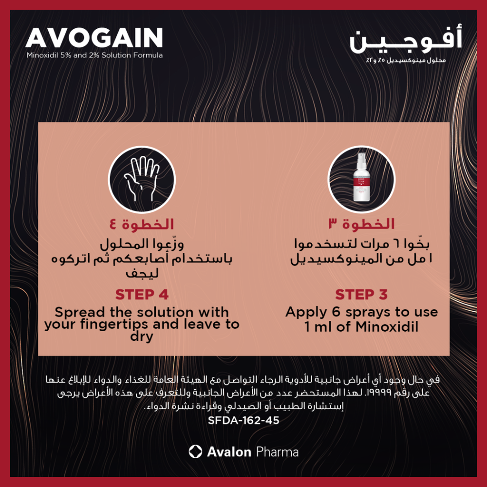 - يتم تنشيف الشعر ومنطقة الصلع قبل استعمال محلول