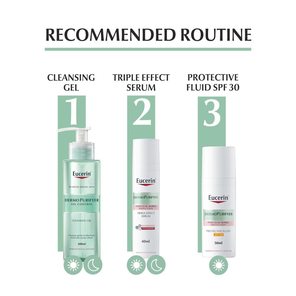 لقد عزز السيروم ذو التأثير الثلاثي الفعالية عند استخدامه مع السائل الوقائي Eucerin DermoPure Protect Fluid SPF 30.